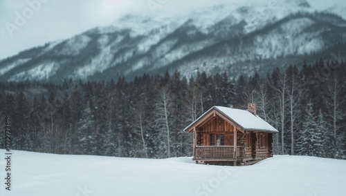 Charming cabin in a snowy setting, surrounded by majestic mountains, reflecting winter tranquility
