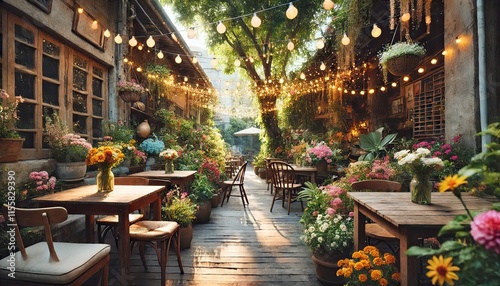 Charming Cafe Courtyard: A sun-drenched cafe courtyard comes alive with vibrant flowers, inviting seating, and warm string lights. The scene exudes a sense of tranquility and warmth.