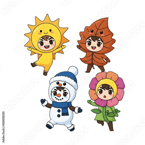 Charming cartoon children in whimsical seasonal costumes representing spring, summer, autumn, and winter