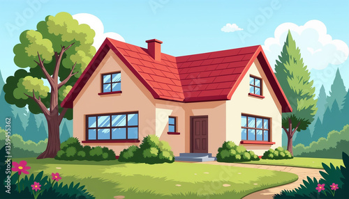 house, cartoon, greenery, flower, nature, landscape, vibrant, sunny, inviting, home, residential, architecture, cheerful, colourful, rural, sunny day, tree, garden, peaceful, charming, picturesque, cosy, warm colors, creative, whimsical, family, living, comfort, calmness, aesthetic, garden path, landscaping, foreground, idylli, serene, bright, artistic, detailed, illustration, suburban, wholesome, habitat, scenery, no people