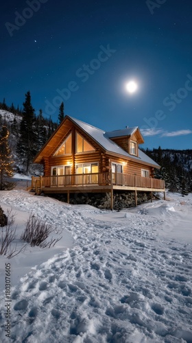 Charming christmas log cabin with festive lights on a frozen lake under moonlit winter sky