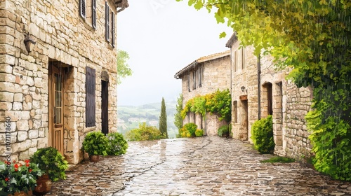 Charming cobblestone street lined with rustic stone buildings and lush greenery in a quaint village.