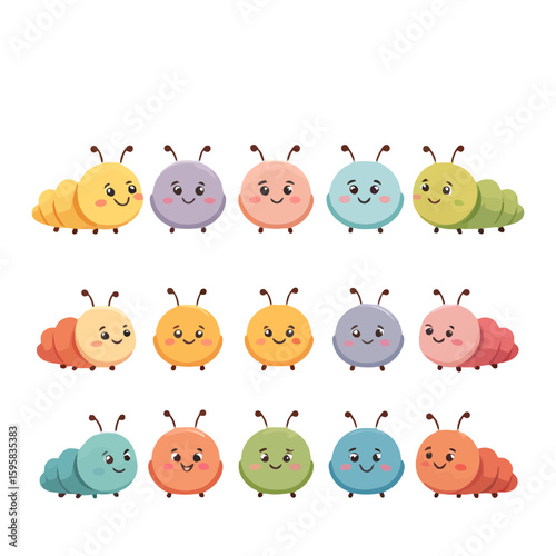 Charming collection of colorful cartoon caterpillars with happy faces, perfect for children's educational materials and playful designs.