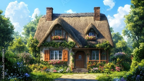 Charming Cottage Surrounded by Lush Garden and Vibrant Flowers