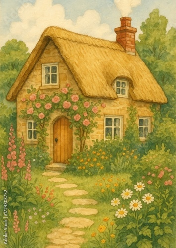 countryside scenery, country house, thatched roof, architecture, illustration, countryside, picturesque, landscape, storybook, wallpaper, whimsical, artistic, charming, peaceful, thatched, bungalow, country, flower, idylli, scenery, design, garden, mobile, nature, quaint, serene, house, rose, vine, path, roof