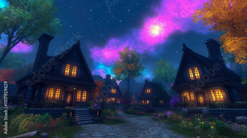 Charming cottages stand in a picturesque village under a starry sky filled with vibrant purple and pink clouds, creating a magical atmosphere