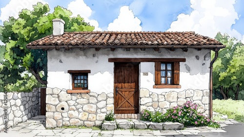 serene, simplicity, calmness, dwelling, escape, greenery, peaceful, idylli, vibrant, warm, heritage, seasonal, artistic, window, inviting, sunlight, roofing, enchanting, quaint, rustic, rural, scenic, charming, illustration, home, door, exterior, house, character, bungalow, flower, texture, creative, stone wall, beauty, flora, nature, environment, culture, summer, architecture, garden, traditional, countryside, landscape, peacefulness