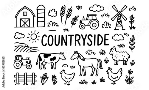 doodle, countryside, farm, animal, rural, barn, tractor, cow, horse, chicken, windmill, sheep, fence, wheat, sun, cloud, nature, vignetting, farmland, agriculture, field, harvest, plant, organic, landscape, simple, drawing, garden, peaceful, serene, hand-drawn