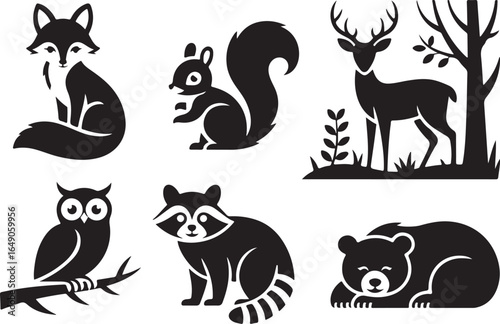 animal, forest, wildlife, nature, fox, squirrel, cervid, owl, raccoon, bear, illustration, icon, graphic, design, black, white, cute, stylised, vector, art, drawing, pattern, collection, set, clip art, element, symbol, mammal, creature, wild, timberland, fauna, silhouetted, simple, modern
