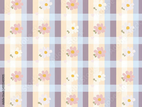 charming gingham pattern with pastel colors features delicate flowers, creating soft and inviting design. combination of stripes and floral elements adds playful touch