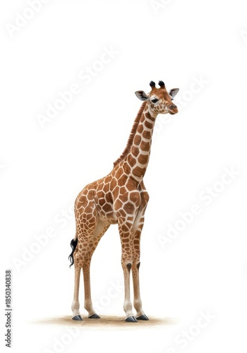Charming illustrated baby giraffe standing peacefully on a bright, pure white background. Minimalist wildlife design ,cartoon ,playful ,adorable