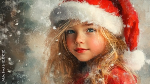 Charming little girl wearing a festive Santa Claus hat with snowflakes gently falling in the background, capturing the spirit of Christmas.