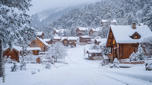 Charming log cabins blanketed in snow rest quietly in a mountainous winter landscape, evoking feelings of warmth, coziness, and seasonal tranquility amidst nature's beauty.