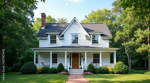 Charming old white victorian farmhouse with a wraparound porch and a brick chimney surrounded by lush green trees and manicured lawn on a sunny day