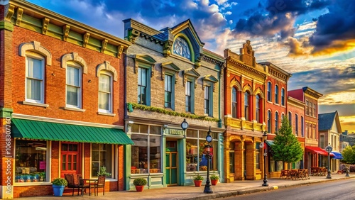 Charming Old-Fashioned Small Town Main Street Facade Featuring Colorful Painted Brick Buildings and Quaint Shopfronts Bathed in Warm Natural Light for a Nostalgic Atmosphere