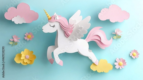 Charming Paper Art Depicting a Flying Unicorn in a Dreamy Landscape