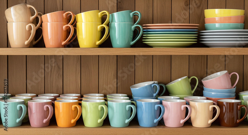 Charming Pastel Ceramic Mugs & Plates on Wooden Shelf - Still Life