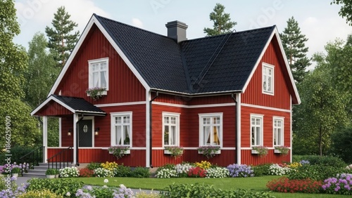 house, bungalow, red, garden, flower, green, roof, window, trim, plant, home, building, nature, tree, grass, land, architecture, estate, landscape