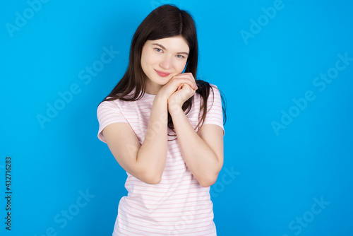 Charming serious young beautiful Caucasian woman wearing stripped T-shirt over blue wall keeps hands near face smiles tenderly at camera