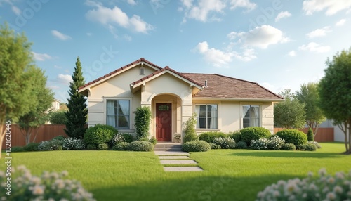 Charming single-story suburban house boasts landscaped front yard, cozy family living. Comfort, security. Modern architecture residence, manicured lawn. Garden with green grass, flowers, trees. Home