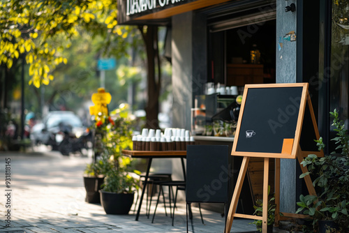 Charming street view of a coffee stand with inviting outdoor seating and lush greenery in a vibrant urban setting
