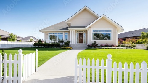 house, lawn, garden, architecture, suburban, exterior, landscaping, pathway, fence, flower, window, door, porch, greenery, sky, residential, suppressing, attracted, design, property, home, entrance, neighbourhood, sunlight, relaxing, inviting, peaceful, tidy, aesthetic, structure, family, space, calmness, nature, scene, beauty, environment, community, comfort, style, layout, charme, modern, clean, serene, maintenance, view, scenery