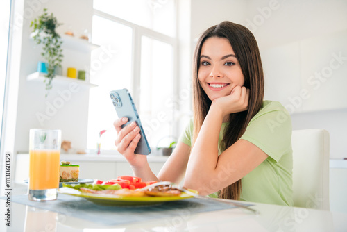 Charming teenager enjoying a sunny kitchen breakfast with a mobile phone in hand