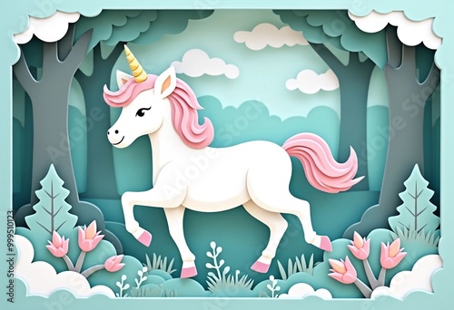 Charming Unicorn in Enchanted Forest Paper Cut Illustration for Nursery Decor