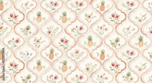 Charming vintage floral and pineapple pattern with a delicate quatrefoil design and soft pastel colors
