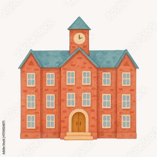 illustration, building, watercolor, architecture, arch, minimalistic, background, vintage, school, shadow, book, charming, college, window, design, clock, style, tower, cute, red, educational, clock-tower, transparent, simple, edge, look, atmosphere, classic, campus, brick, clean, proportion, whimsy, sharp, nostalgic, entrance, isolated, dreamy, roof, children, suitable, institution