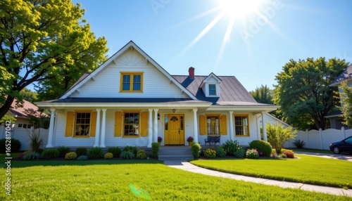 Charming White House with Yellow Accents Surrounded by Lush Greenery and Bright Sunshine