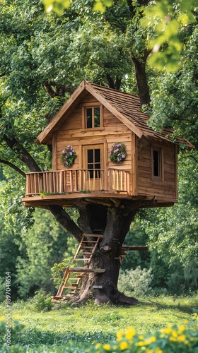 Charming wooden treehouse surrounded by lush green foliage in a serene setting.
