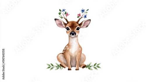 Charming young deer with floral antlers nature scene illustration whimsical close-up cute animal art