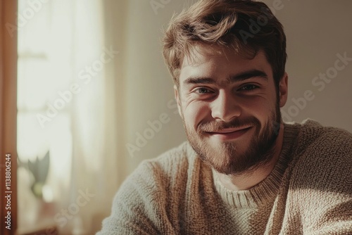 Charming young man enjoys warm afternoon light while smiling in a cozy interior filled with natural warmth and friendly vibes at home