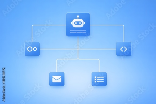 bot, ai, artificial, intelligence, automation, communication, service, network, connection, search, magnifying, glasses, code, programming, bracket, electronic mail, message, list, checklist, icon, digital, technology, workflow, process, business, support, online, interactive, software, application, flat, blue