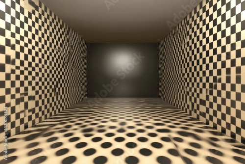 room, interior, chequered, pattern, polka, dot, perspective, shadow, light, empty, space, design, modern, minimalist, geometric, abstract, three-dimensional, virtual, architecture, visualisation, illusion, optical, contemporary, beige, black, gold, dark, grey, texture, wall, floor, creative, visual, art, rendering, digital, illustration, photorealistic, background, interior design, decor, home, office, gallery
