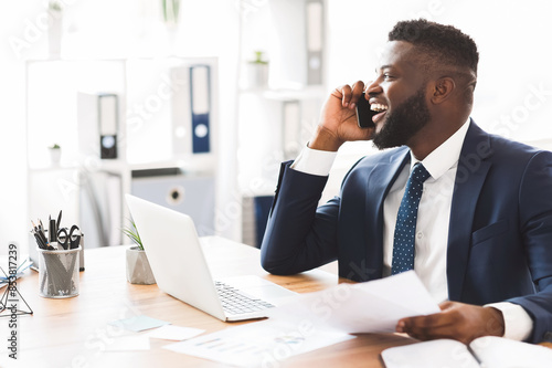 Cheerful afro entrepreneur talking with companion on phone, holding contract, office interior, free space