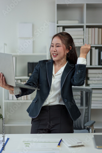 Cheerful and confident Asian businesswoman stands presenting bar chart data from a laptop folder in an online meeting in the office. Startup business ideas, accounting, online marketing.