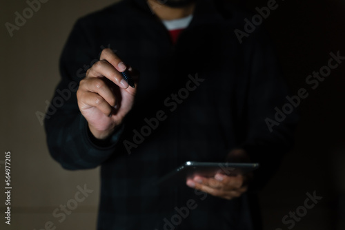 Cheerful bearded man in black long sleeve shirt using digital tablet in Dark room. hand holding tablet.