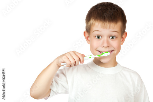 cheerful boy is brushing his teeth isolated
