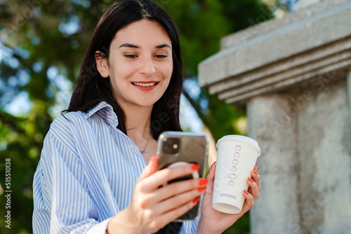 caffeine, hot, hot drink, drinking, mug, take, away, mobile, communication, phone, technology, smartphone, using, smart, message, app, mobile phone, connection, text message, device, browsing, checking, media, watching, phone, digital, chat, mail, play, holding, payment, transaction, call, female, she, girl, lady, beauty, attractive, cute, pretty, 20s, brunette, hair, white, caucasian, young, person, woman