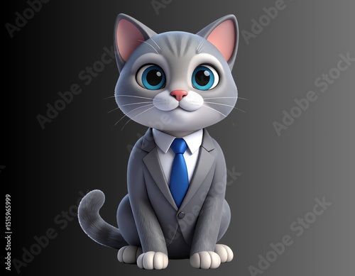 Cheerful Business Cat Character in Suit, Seated in Upright Pose, 3D Render
