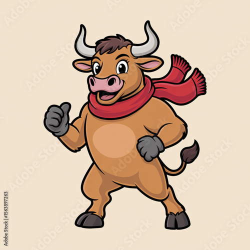 Cheerful Cartoon Bull with Red Scarf in Dynamic Pose