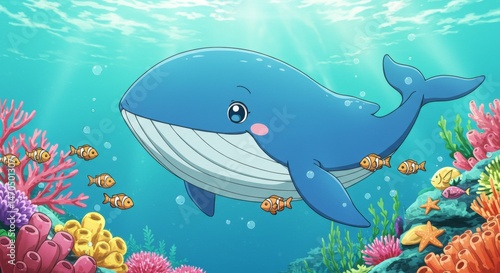 Cheerful cartoon whale swimming among colorful coral and fish