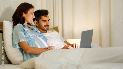 Cheerful Caucasian pregnant woman smiling as enjoy use laptop computer for health nourishment to prepare birth of unborn baby while resting on bed in bedroom of condominium.