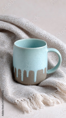 cheerful ceramic mug with frosted tips, fabric wrap, wax drips with subtle shine.