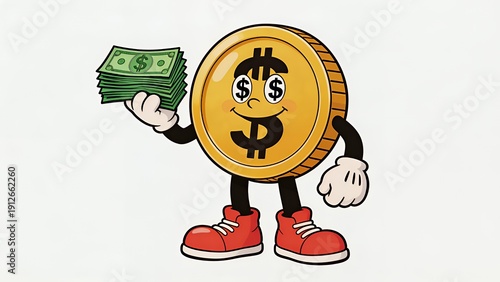 cheerful, coin, character, dollar, symbol, mascot, cash, illustration, gold, money, happy, smiling, currency, cartoon, animated, wealth, finance, savings, prosperity, green, bill, stack, hand, red, shoe, white, glove, design, art, icon, economy, wealthy