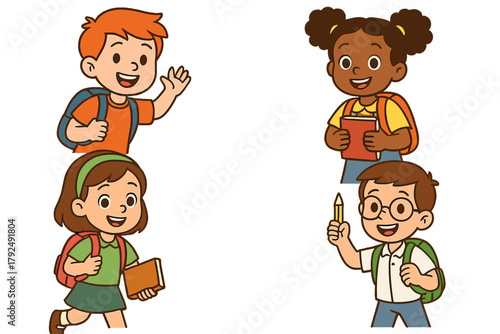 school, children, diverse, cheerful, backpack, book, ready, first, day, children, student, group, education, learning, back to school, elementary, primary, childhood, happy, smiling, multicultural, friendship, youth, crayons, uniform, walking