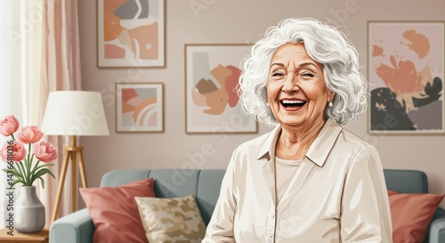 Cheerful elderly woman with curly white hair smiling joyfully in a cozy living room decorated with modern art and flowers, conveying warmth and happiness