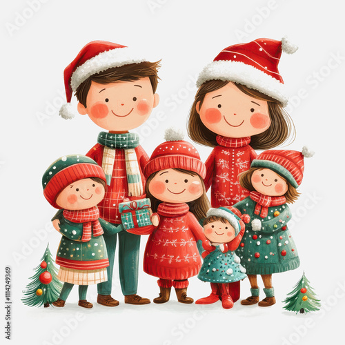 family, christmas, winter, celebration, togetherness, joy, happiness, festive, children, gift, holiday, season, tradition, seasonal, cute, smiling, love, bonding, snow, red, green, present, decoration, tree, playful, sibling, colourful, cheerful, cosy, warmth, fun, artistic, illustration, innocence, hugs, gathering, art, character, joyfulness, together, childhood, nostalgia, oneness